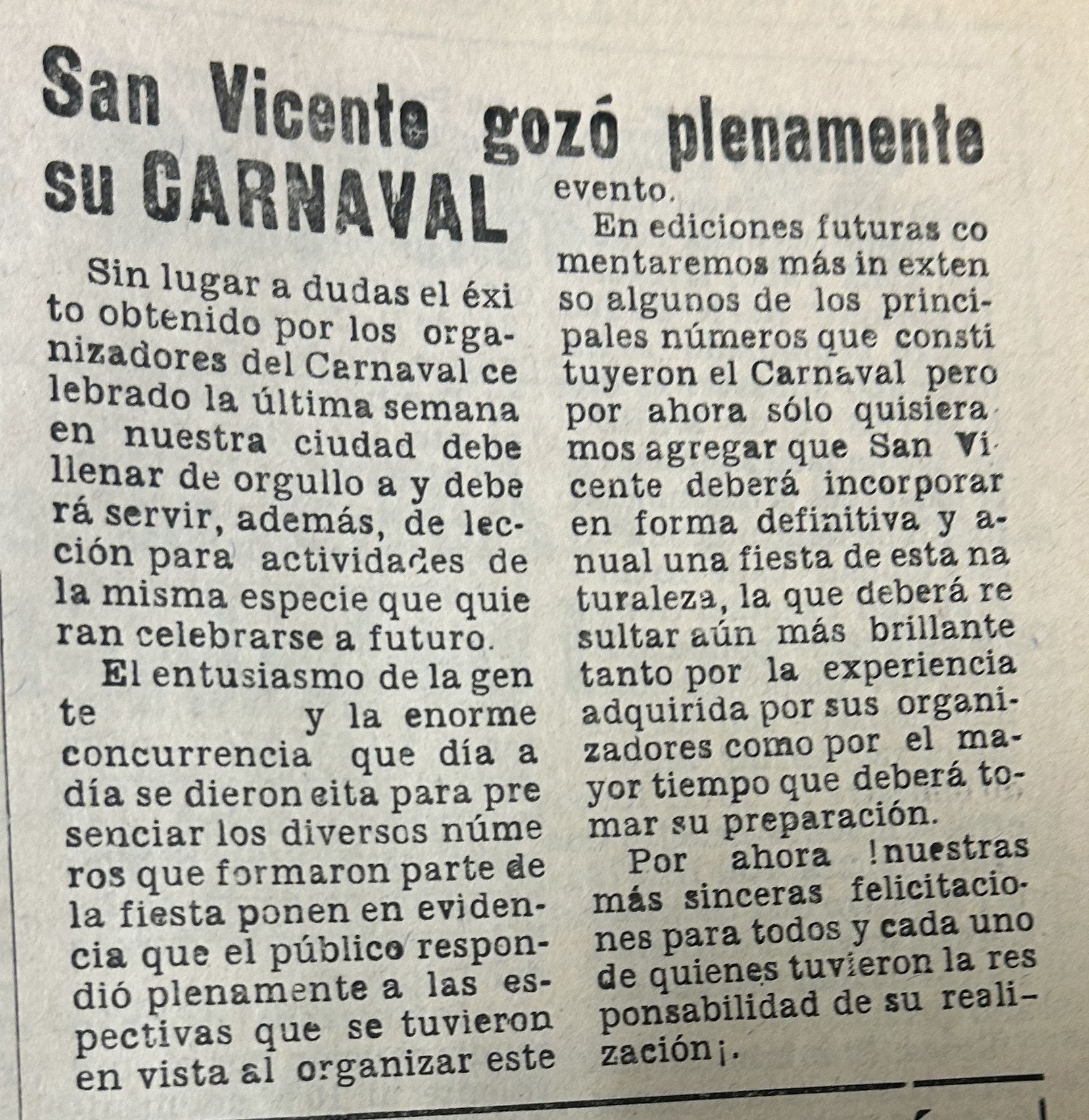 Debe ser el evento más importante del año en San Vicente. En 1983 se escuchó por primera vez la organización del Carnaval de Verano de nuestra comuna. Más de 4 décadas después se ha transformado en uno de los eventos veraniegos más esperados en la región. Sin embargo, es sorprendente recordar como ha evolucionado este evento a lo largo de los años, especialmente respecto de la primera edición hace 42 años.