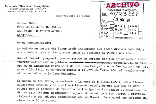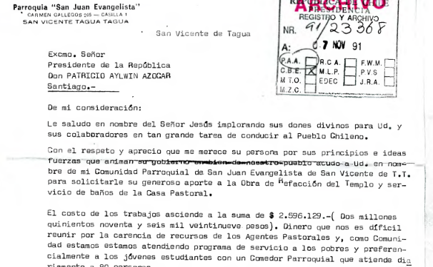 Párroco de San Vicente, Bernabé Silva solicita al presidente Patricio Aylwin recursos para obras de refacción del templo (07 de noviembre de 1991). Incluye respuesta del jefe de gabinete del presidente, Carlos Bascuñán, del 12 de noviembre de 1991.