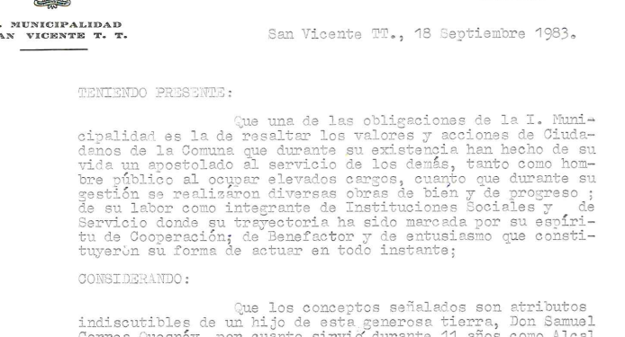 Decreto declara Ciudadano Ilustre a Samuel Correa Quesney, 1983