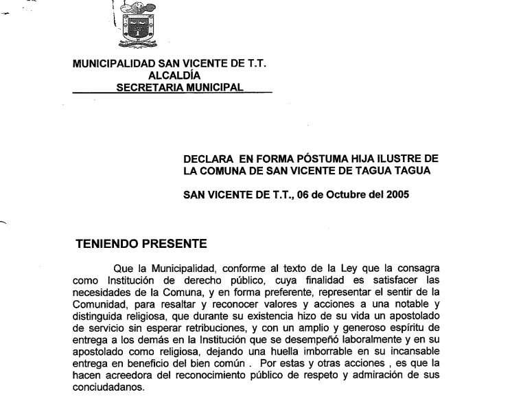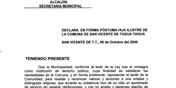 Decreto Hija Ilustre a Madre Lelia Toro Cornejo