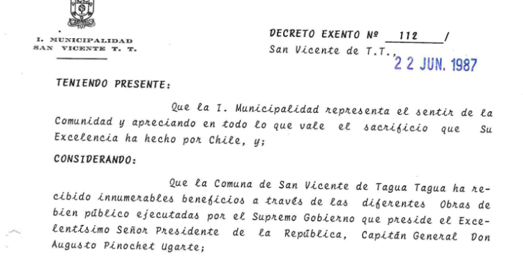 Decreto municipal declara Hijo Ilustre a Augusto Pinochet, 1987