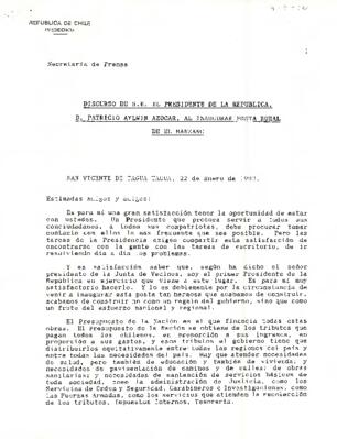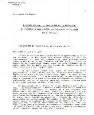Discurso del Presidente de la República, Patricio Aylwin Azocar, al inaugurar Posta Rural del Manzano, 22 de enero de 1993.