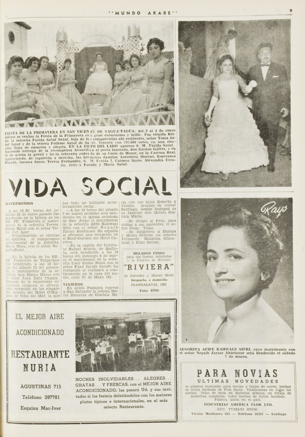 Nota de prensa del periódico "Mundo Árabe", del 28 de febrero de 1959 (página 9), en que da cuenta de la reciente elección de la reina de la Fiesta de la Primavera de San Vicente de dicho año, siendo elegida Farida Satuf Satuf.