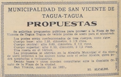 Inserto en el Diario La Nación del 28 de marzo de 1931 en que la Municipalidad de San Vicente solicita propuestas para la instalación 20 de postes de acero para el alumbrado de la plaza de armas.