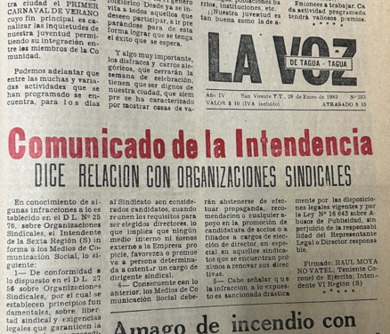 Portada de La Voz de Tagua-Tagua del 28 de enero de 1983, que informa sobre la organización del primer Carnaval de Verano en la comuna.