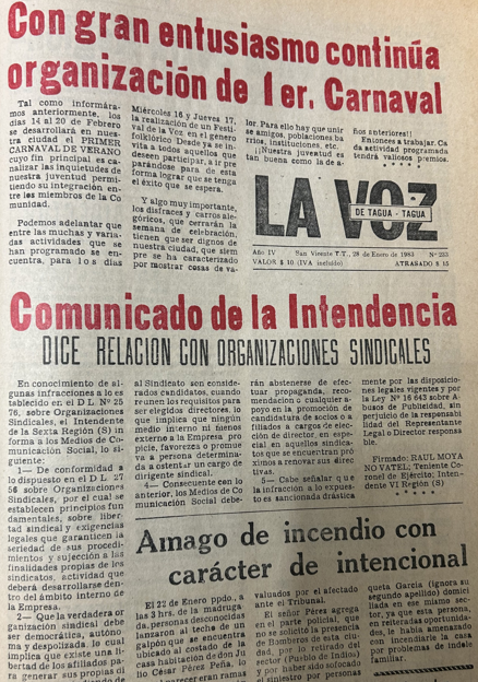 Portada de La Voz de Tagua-Tagua del 28 de enero de 1983, que informa sobre la organización del primer Carnaval de Verano en la comuna.