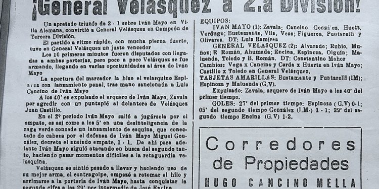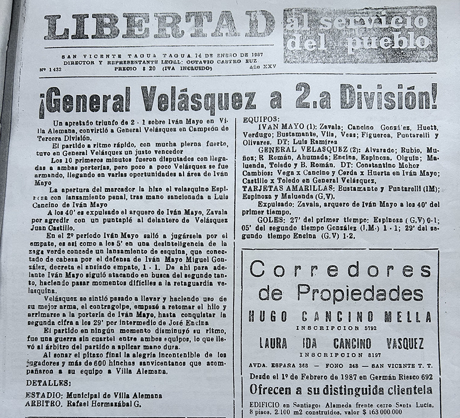 Portada del diario Libertad, del 14 de enero de 1987, en que da cuenta del título de General Velásquez en el torneo de Tercera División 1986 obtenido el 11 de enero tras derrotar a Iván Mayo en Villa Alemana. Con esto, lograba el ascenso a la Segunda División.